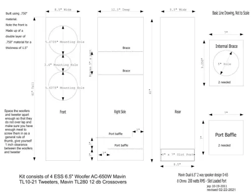 Mavin 6.5" Dual Woofer Tower Speaker Kit with Plans 250 watts, 32 Hz. to 21 kHz